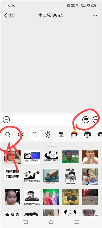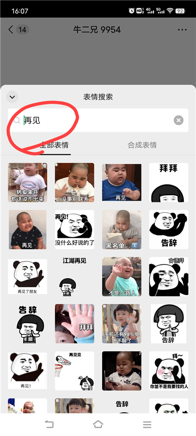 输入你想要的表情关键词,比如:羡慕,再见,可以看到很多的表情,可以选择,点击一个表情就会发到聊天对话里